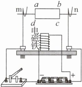 4. 如图所示,一个综合实践小组用一段漆包线绕成线圈 abcd,用小刀刮两端引线的漆皮,一端全部刮去,另一端只刮上半周或下半周. 将线圈 abcd 放在用硬金属丝做成的支架 m、n 上,并按如图所示连接电路,则电磁铁的上端是