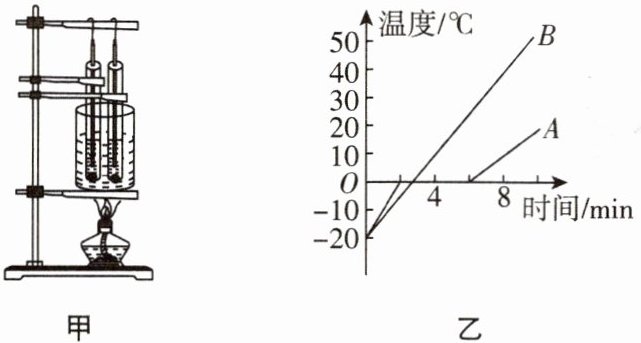 21. 如图所示的实验中,小明将质量相等的冰和石蜡分别装在两个相同的试管中,并放在一个装有水的大烧杯中进行加热,如图甲所示。根据实验数据绘制的温度随时间变化的图像如图乙所示。请回答下列问题。