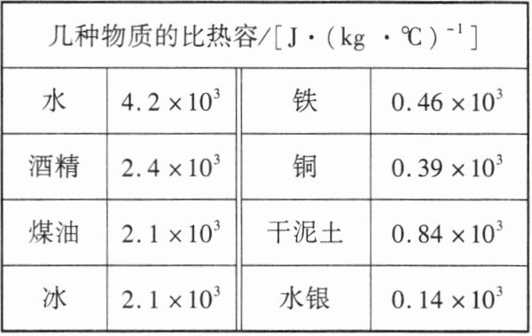 )。| 几种物质的比热容/$[J \cdot (kg \cdot ° C)^{-1}]$ |