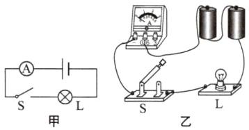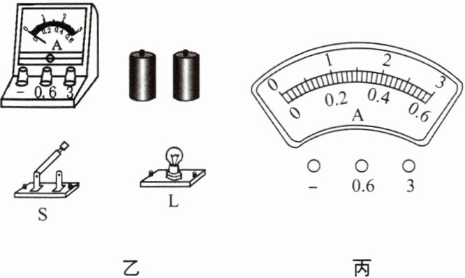 (3) 找到合适的测量范围后闭合开关,电流表指针刚好指在$0.3\ A$处,请在图丙中选择合适的接线柱并标出电流表指针所在的位置.