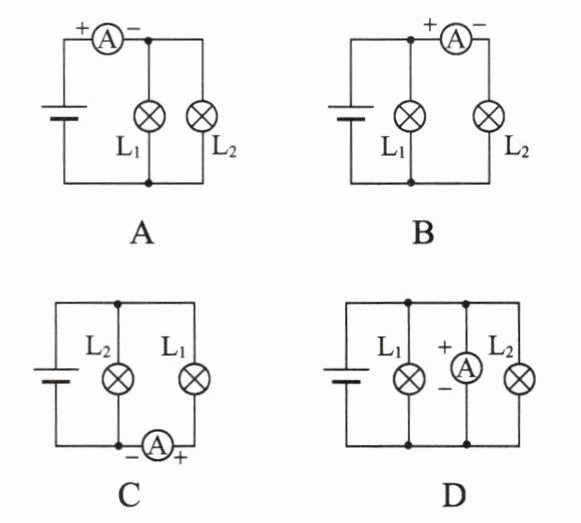 3. 在如图所示的电路图中,能正确测量通过灯泡$L_1$的电流的是(