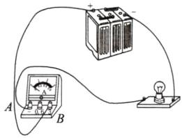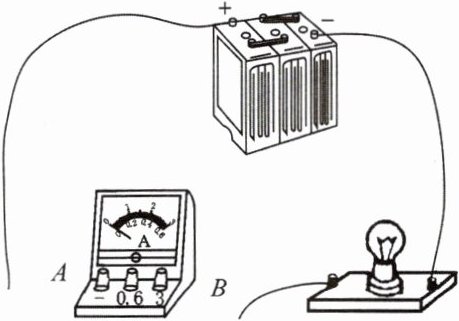 1. 在如图所示的电路中,用电流表测量小灯泡中的电流,估计小灯泡中的电流大约为$0.7\ A$,请将$A$、$B$线头接入合适的接线柱.