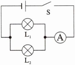 1. 如图所示, 闭合开关 $ S $, 通过 $ L_1 $ 的电流为 $ 0.2 \, A $, 通过 $ L_2 $ 的电流为 $ 0.23 \, A $, 则此时电流表的示数为