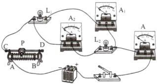 (3) 小方将以上电路连接完后, 闭合开关, 调节滑动变阻器, 发现灯泡 $ L_1 $ 和 $ L_2 $ 发光, 电流表 $ A_1 $ 和 $ A_2 $ 有示数、电流表 $ A $ 示数为零. 电路故障可能是______.