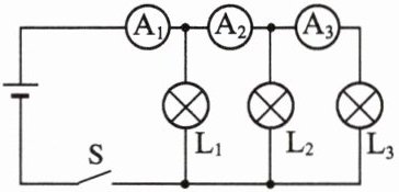 9. 如图所示, 闭合开关 $ S $, 电流表 $ A_{1} $、$ A_{2} $、$ A_{3} $ 的示数分别为 $ 2.8 \, A $、$ 1.9 \, A $、$ 0.7 \, A $, 那么通过这 3 盏灯的电流不可能的是 (
