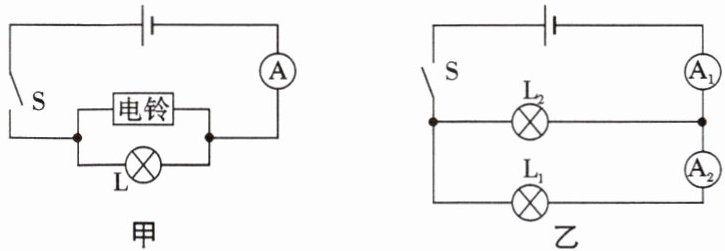 (3) 在如图甲所示的电路中, 电流表示数为 $ 1.2 \, A $, 通过灯 $ L $ 的电流为 $ 0.4 \, A $, 则通过电铃的电流大小为