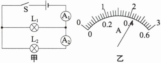 (4) 如图乙所示, 若电流表 $ A_{1} $ 的示数为 $ 1.5 \, A $, 电流表 $ A_{2} $ 的示数是干路电流