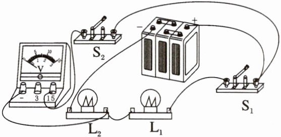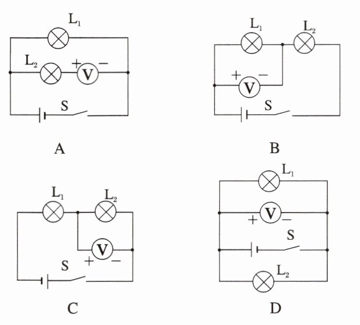 1. 在如图所示的 4 个电路中,当开关 $ S $ 闭合时,能用电压表测出灯 $ L_{2} $ 两端电压的电路是(