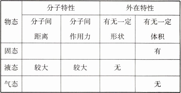 | |分子间距离|分子间作用力|有无一定形状|有无一定体积|