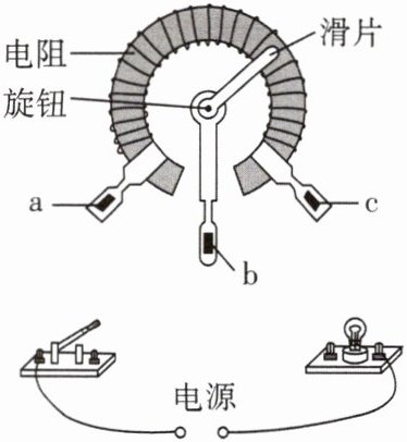 2. 小乐所在的物理兴趣小组研究了一种调光台灯. 如图是它的内部电位器(作用相当于滑动变阻器)的结构示意图,a、b、c 是它的 3 个接线柱. 请用笔画线代替导线按要求完成电路的连接. 要求:闭合开关时,旋钮带动滑片逆时针转动时,灯泡变亮(电源未画出).