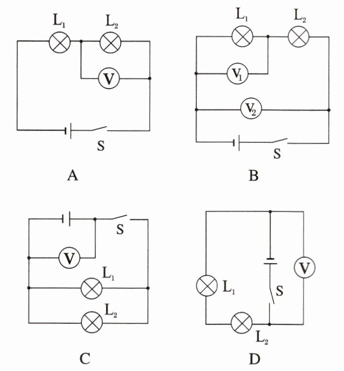 2. 如图所示,下列电路图中不能测出灯 $ L_{2} $ 两端电压的是(