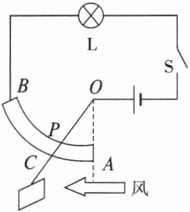 12. 小雨同学在学习完滑动变阻器的知识后,试着设计一个风力测定仪,其中 $ O $ 是转动轴,$ OC $ 是金属杆,下面连着一块受风板. 无风时,$ OC $ 是竖直的;风越大,$ OC $ 杆偏转角度越大. $ AB $ 是一段弧形电阻,$ P $ 点是金属杆与弧形电阻相接触的点. 根据小雨设计的这个测定仪,完成下列问题.