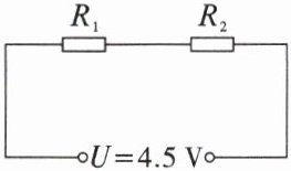4. 如图所示, 将电阻 $R_1$、$R_2$ 串联接在电压为 $4.5 V$ 的电源上. 已知 $R_1$ 的阻值为 $5\ \Omega$, $R_2$ 两端的电压为 $3\ V$, 求电路中的总电阻和通过 $R_2$ 的电流大小.