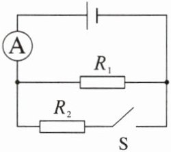 4. 如图所示, 电阻 $R_1$ 的阻值为 $12\ \Omega$. 当开关断开时, 电流表的读数为 $0.5\ A$; 当开关闭合时, 电流表的读数为 $1.5\ A$, 求电源电压和电阻 $R_2$ 的阻值.