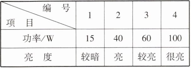 4. 张潇发现家里各种白炽灯的亮度不同,于是请爸爸把每盏灯都拿下来,装在同一个房间的台灯罩下观察,并把每盏灯的功率及亮度关系列在下表中.