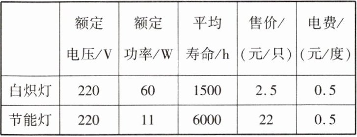 17. 现在市场上有一种“220 V 11 W”的节能灯,它的发光效果与“220 V 60 W”的普通白炽灯相当。下表是这两种灯的有关参数:
