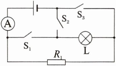 16. 在如图所示的电路中,电阻$R_1$的阻值是12 Ω。当闭合开关$S_2、$断开$S_1$和$S_3$时,电流表的示数是0.5 A,灯L的实际功率是额定功率的1/4;当断开开关$S_2、$闭合$S_1$和$S_3$时,灯泡L刚好能正常发光,求灯泡L的额定电压和额定功率。(灯泡的电阻值保持不变。)