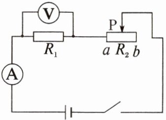 15. 如图所示,已知$R_1 = 10 Ω,$滑动变阻器$R_2$的最大阻值为10 Ω,U = 6 V,问:在移动滑片P时,电阻$R_1$电功率的变化范围是多大?