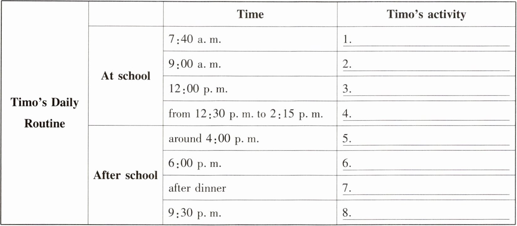| Timo's Daily Routine | | from 12:30 p.m. to 2:15 p.m. | 4.