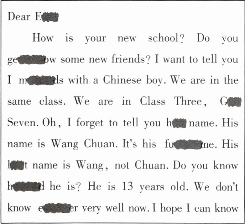 二、下面是 Tim 寄给 Eric 的一封信,但信件不小心滴上了墨水,有些内容看不清了。请你根据显示出来的部分将信件内容补充完整。