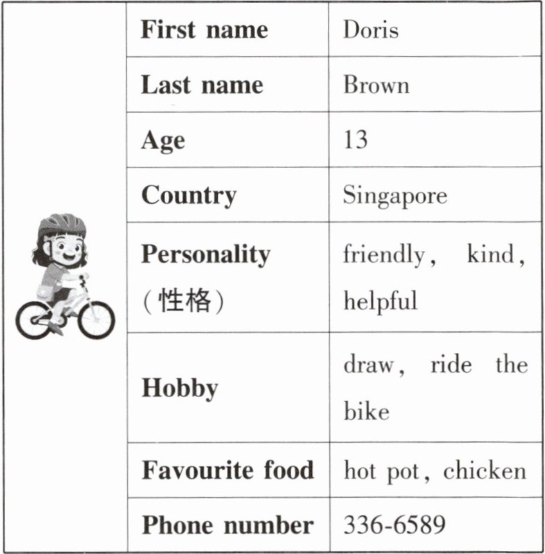 One possible version:Hello, everyone. I have a new friend, and she is from Singapore. Her name is Doris Brown. Doris is her first name and Brown is her last name. She is 13 years old. She is really a nice girl. She is very friendly, kind and helpful. She likes drawing and riding the bike in her free time. She loves hot pot and chicken very much. If you want to be her friend, you can call her. Her phone number is 336-6589.