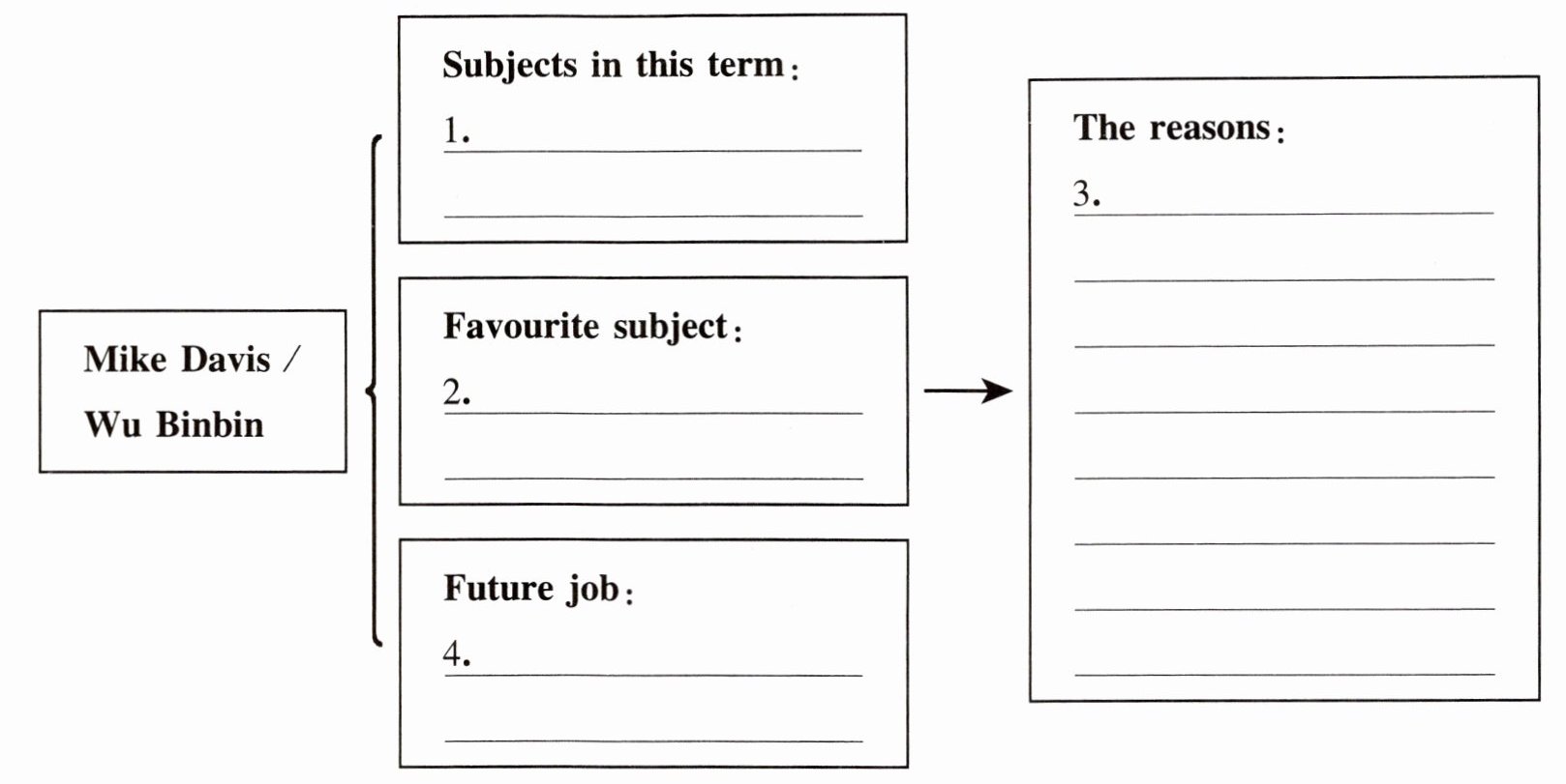 四、根据课本第 48 页 1b 的语篇内容,从 Mike Davis 和 Wu Binbin 中任选一个,完成下面的思维导图。