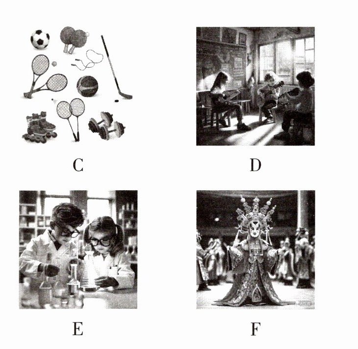 一、下列图片分别代表的是哪一个社团呢?请将图片序号填写在对应社团名称前的括号内。