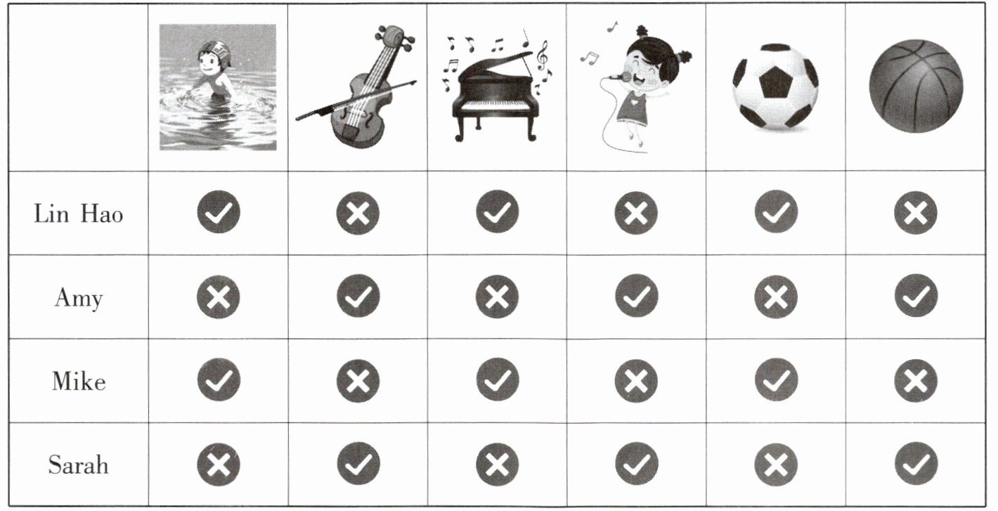 任务一:认真阅读调查表,用 can 或 can’t 完成下列句子,汇报同学们的才艺。