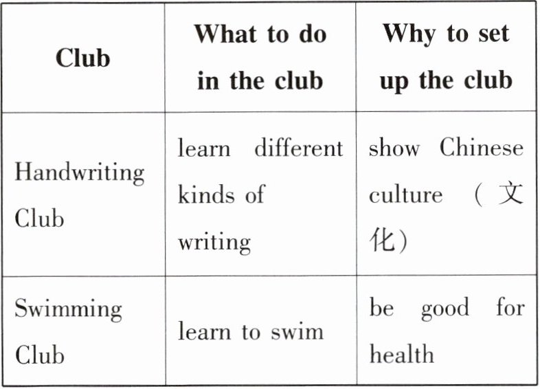 | Handwriting Club | learn different kinds of writing | show Chinese culture (文化) |