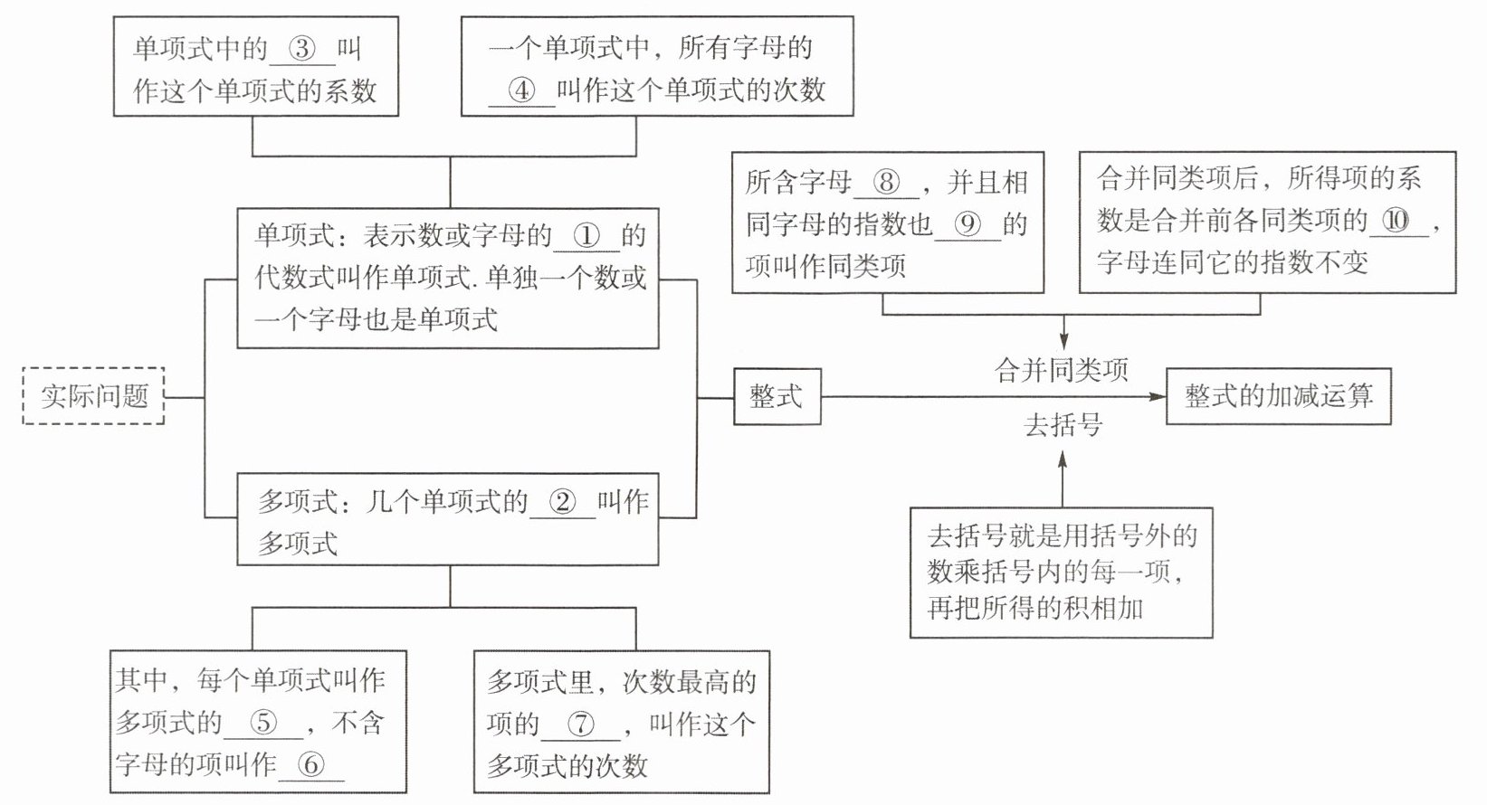①积 ②和 ③数字因数 ④指数的和 ⑤项 ⑥常数项 ⑦次数 ⑧相同 ⑨相同 ⑩系数的和