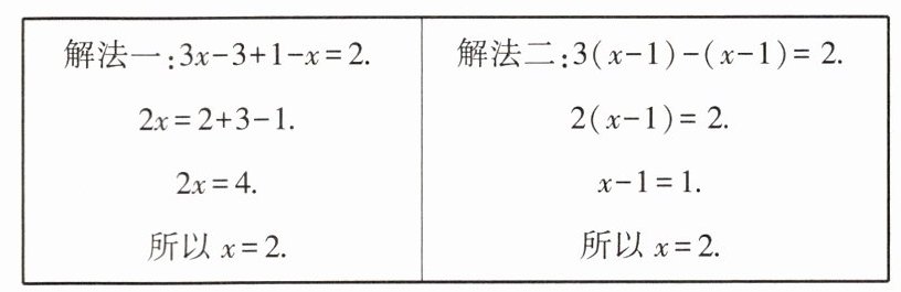 11. (★)请品尝方程$3(x - 1) + 1 - x = 2$的两种解法: