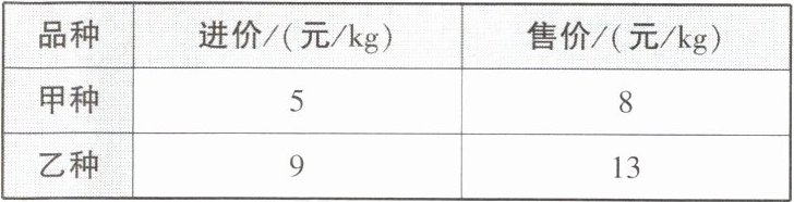 (1)设甲种水果购进$x\ kg$,则乙种水果购进$(140-x)\ kg$,根据题意,得$5x+9(140-x)=1000$.解得$x=65$.所以$140-x=140-65=75$.所以甲种水果购进$65\ kg$,乙种水果购进$75\ kg$.(2)$(8-5)×65+(13-9)×75=495$(元).所以获得的利润是495元.(3)$495-0.1×140=481$(元).所以该水果店售完这批水果获得的利润是481元.