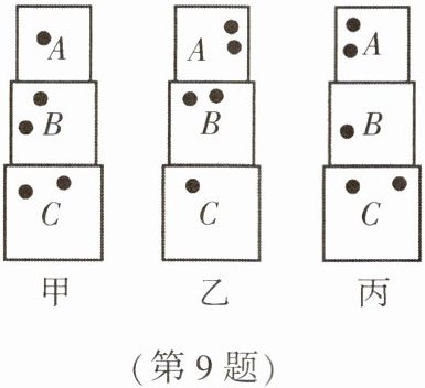 9. (★★)为了提高学生体育锻炼的意识,七年级(1)班进行了一次投掷实心球的测试,老师在操场上画出了 $ A $、$ B $、$ C $ 三个区域,每人投掷 5 次,实心球落在各个区域的分值各不相同,其中落在 $ C $ 区域得 3 分。甲、乙、丙三位同学投掷后其落点如图所示。已知甲同学的得分是 19 分。请解答下列问题: