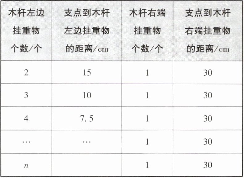(1)根据以上小明的记录,能发现规律:木杆左边挂重物个数与支点到木杆左边挂重物的距离的乘积不变,均为30;而木杆的总长为60 cm,则木杆左边挂重物个数与支点到木杆左边挂重物的距离的乘积等于木杆右边挂重物个数与支点到木块右边挂重物的距离的乘积.