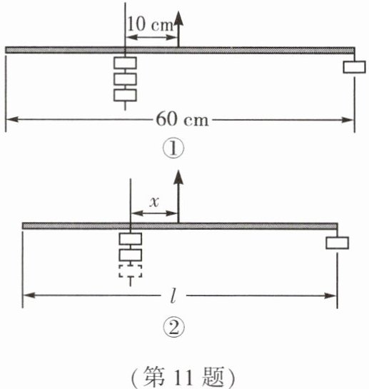11. (★★)实验与探究:小明学完一元一次方程后,用一根质地均匀 $ 60cm $ 长的木杆和一些等重的小物体,做下列实验: