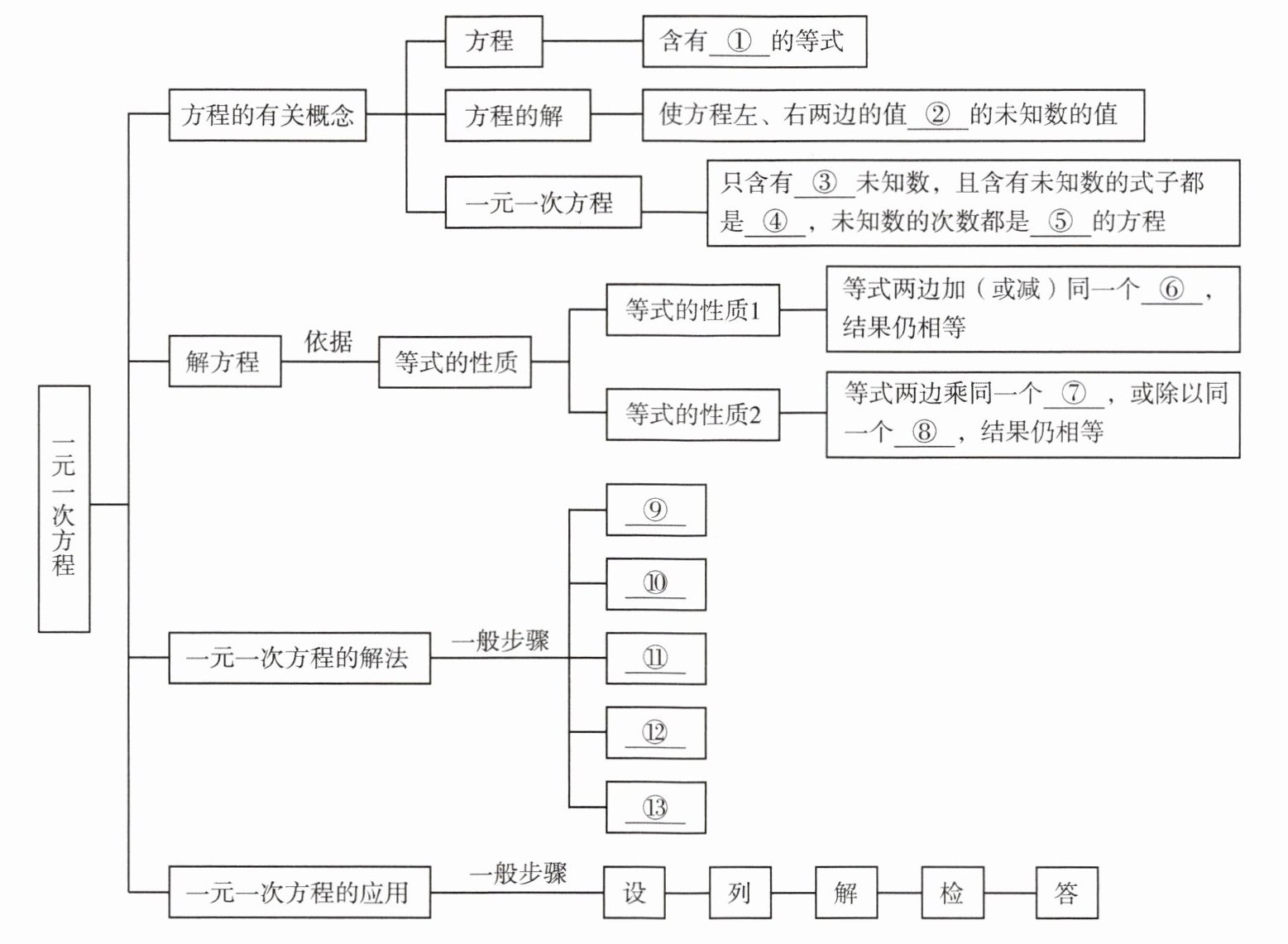 未知数 相等 一个 整式 1 数(或式子) 数 不为0的数 去分母 去括号 移项 合并同类项 系数化为1