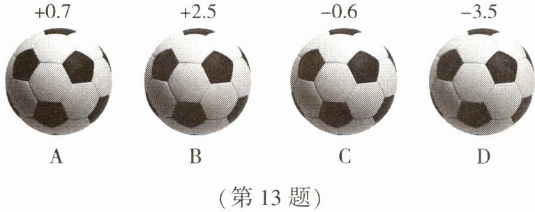 13. (★)如图,检测 4 个足球,其中超过标准质量的克数记为正数,不足标准质量的克数记为负数. 从轻重的角度看,最接近标准质量的是 【