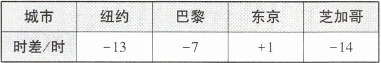 15. 下表列出了国外几个城市与北京的时差(带正号的数表示同一时刻比北京早的时数,比如,北京时间早上$9:00$时,巴黎时间为凌晨$2:00$)。