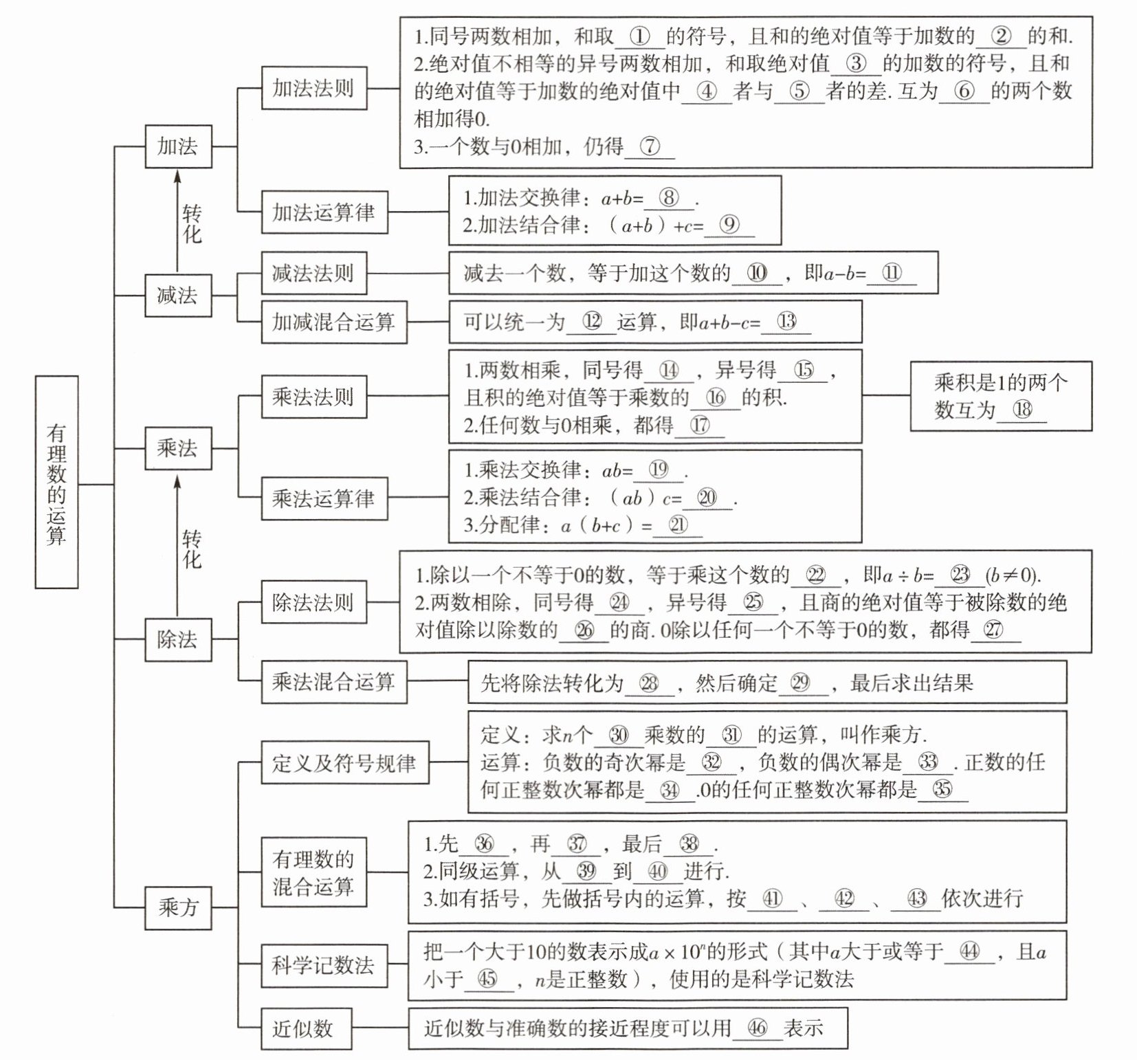 1.相同 2.绝对值 3.较大 4.较大 5.较小 6.相反数 7.这个数 8.b+a 9.a+(b+c) 10.相反数 11.a+(-b) 12.加法 13.a+b+(-c) 14.正 15.负 16.绝对值 17.0 18.倒数 19.ba 20.a(bc) 21.ab+ac 22.倒数 23.a·$\frac{1}{b}$ 24.正 25.负 26.绝对值 27.0 28.乘法 29.积的符号 30.相同 31.积 32.负数 33.正数 34.正数 35.0 36.乘方 37.乘除 38.加减 39.左 40.右 41.小括号 42.中括号 43.大括号 44.1 45.10 46.精确度