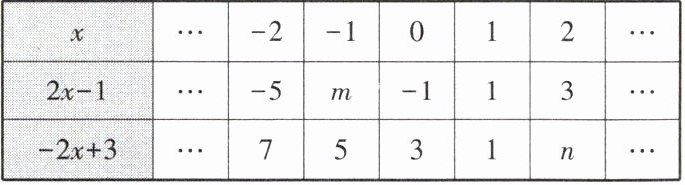 .(2)【归纳规律】表中代数式 $ 2x - 1 $ 的值的变化规律是 $ x $ 的值每增加 1,$ 2x - 1 $ 的值就增加 2. 类似地,代数式 $ -2x + 3 $ 的值的变化规律是 $ x $ 的值每增加 1,$ -2x + 3 $ 的值就