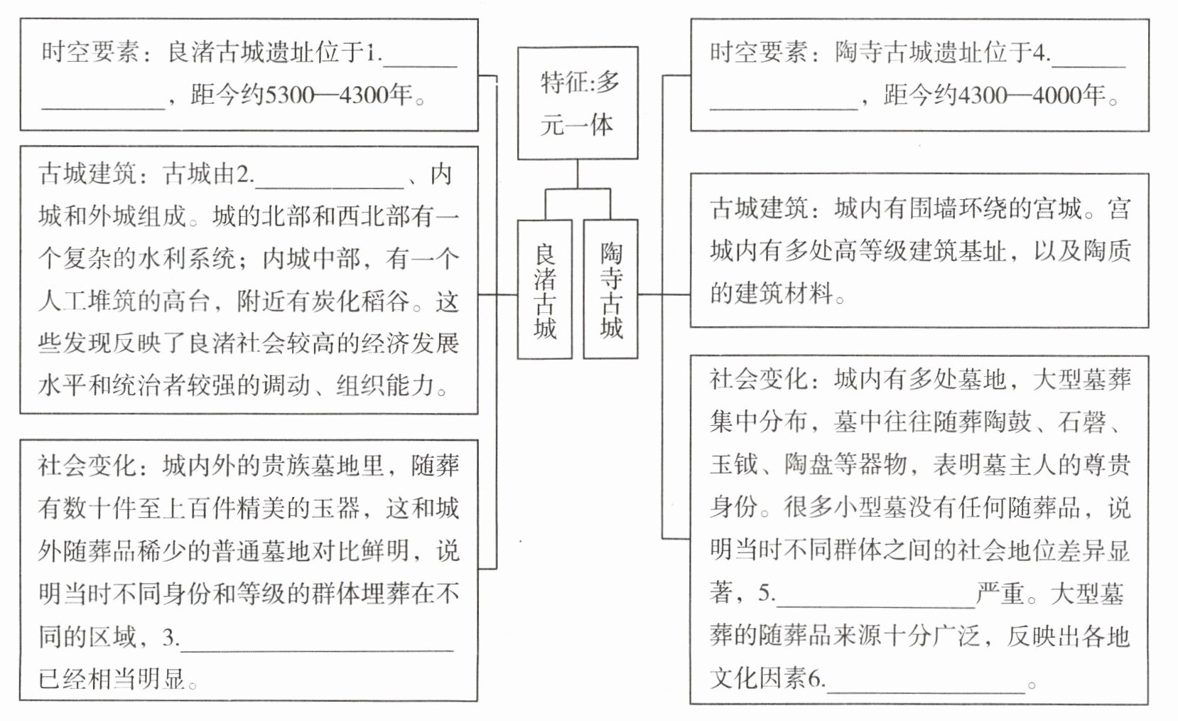 1.浙江余杭 2.宫殿区 3.社会的阶级分化 4.山西襄汾 5.阶级分化 6.汇聚中原