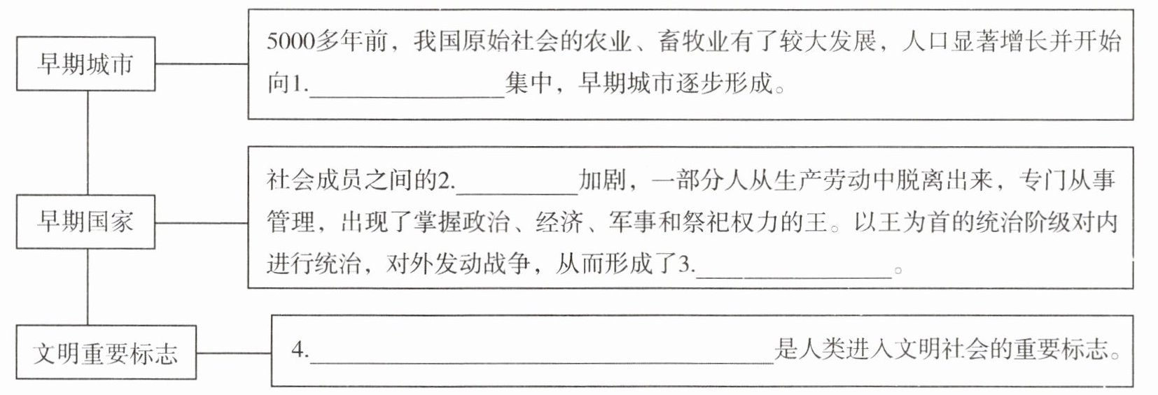 随着我国农业、畜牧业的发展,人们开始向区域中心集中,早期城市逐步形成;社会成员之间的分化加剧,出现了统治阶级,统治阶级对内进行统治,对外发动战争,早期国家形成,我国开始进入文明社会。