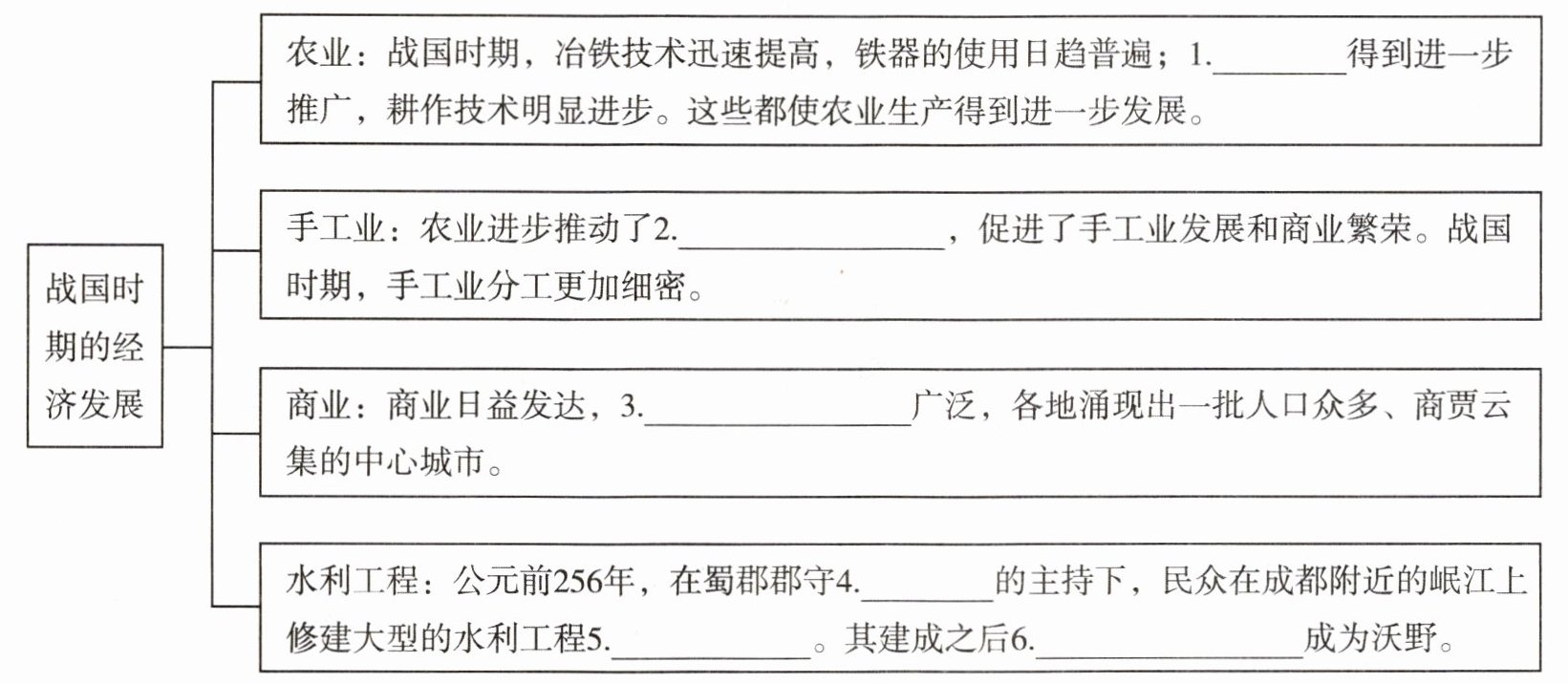 1.牛耕 2.社会分工 3.货币流通 4.李冰 5.都江堰 6.成都平原 思考三:铁制农具和牛耕技术进一步推广;手工业分工更加细密;商业日益发达;各国兴修水利。