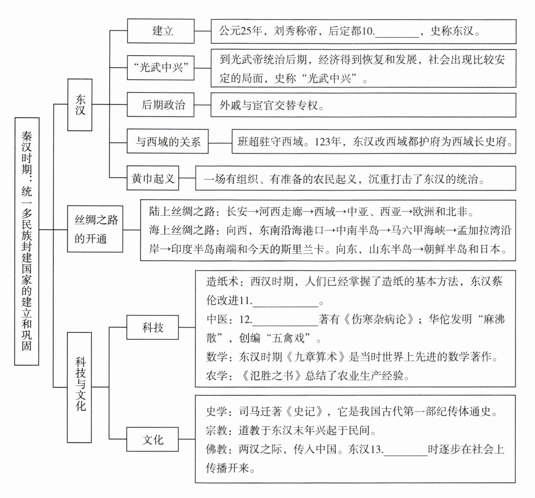 1.以皇帝为中心的中央集权 2.文字 3.货币 4.东海 5.长城一带 6.暴政 7.刘邦 8.长安 9.北击匈奴 10.洛阳 11.造纸工艺 12.张仲景 13.明帝