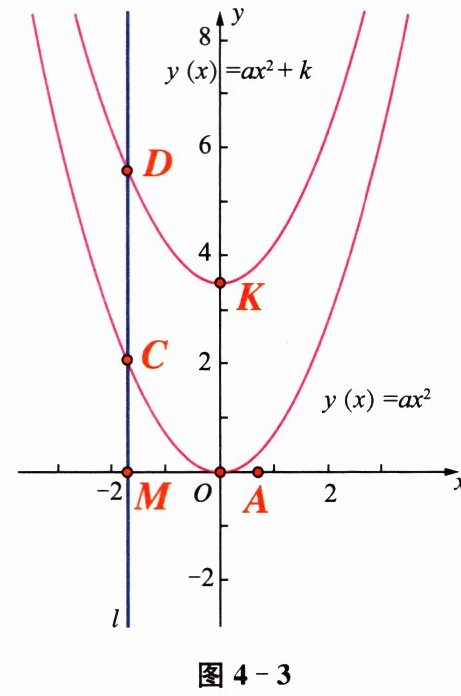 打开动态几何软件,在 x 轴上任取一点 A,用字母 a 表示点 A 的横坐标,在 y 轴上任取一点 K,用字母 k 表示点 K 的纵坐标,画二次函数 $ y= ax^{2} $ 的图像和 $ y= ax^{2}+k $ 的图像,如图 4-3 所示.