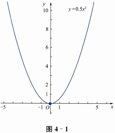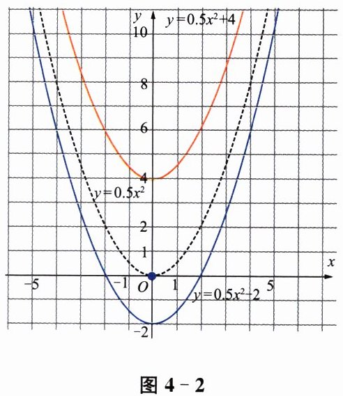 剪下附录 B 中如图 4-1 所示的透明纸片.将透明纸片上的二次函数 $ y= 0.5x^{2} $ 的图像与图 4-2 中的二次函数 $ y= 0.5x^{2} $ 的图像(虚线图)重合,把透明纸片沿 y 轴向上平移 4 个单位长度.你有什么发现?请通过计算验证你的发现.