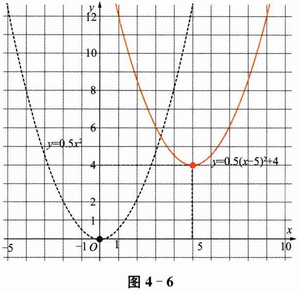 将透明纸片上二次函数 $ y= 0.5x^{2} $ 的图像与图 4-6 中的二次函数 $ y= 0.5x^{2} $ 的图像(虚线图)重合,把透明纸片沿 x 轴向右平移 5 个单位长度,再沿过点(5,0)且平行于 y 轴的直线向上平移 4 个单位长度.你有什么发现?