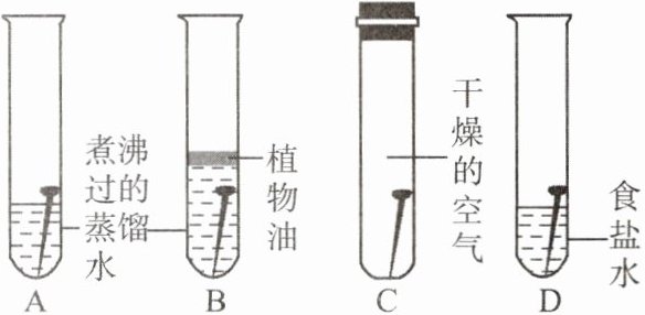 解析:B中缺少氧气,铁钉不易生锈;C中缺少水分,铁钉不易生锈;A中铁钉同时接触氧气和水分,铁钉生锈;D中铁钉既接触氧气和水分,又有盐存在,生锈严重。故通过A、B对比可知影响钢铁生锈的因素是氧气;通过A、C对比可知影响钢铁生锈的因素是水分;通过A、D对比可知影响钢铁生锈快慢的因素是盐。由此可得出,铁生锈的条件是同时接触氧气和水分;盐溶液的存在会加快铁的锈蚀。