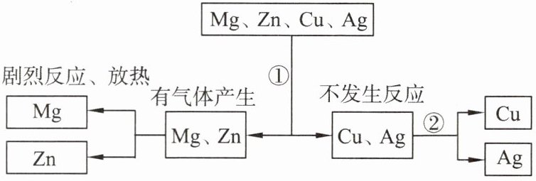 11. 某同学为探究镁、锌、铜、银的活动性顺序,设计如图所示实验流程。依据流程设计,下面对物质①②的选择合理的是(