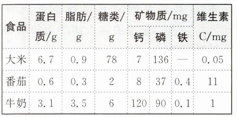 7. 日常生活中合理膳食、均衡营养都需要了解一定的化学知识。大米、番茄和牛奶是生活中常见的食品,每 100g 食品中的营养成分的含量如表所示。